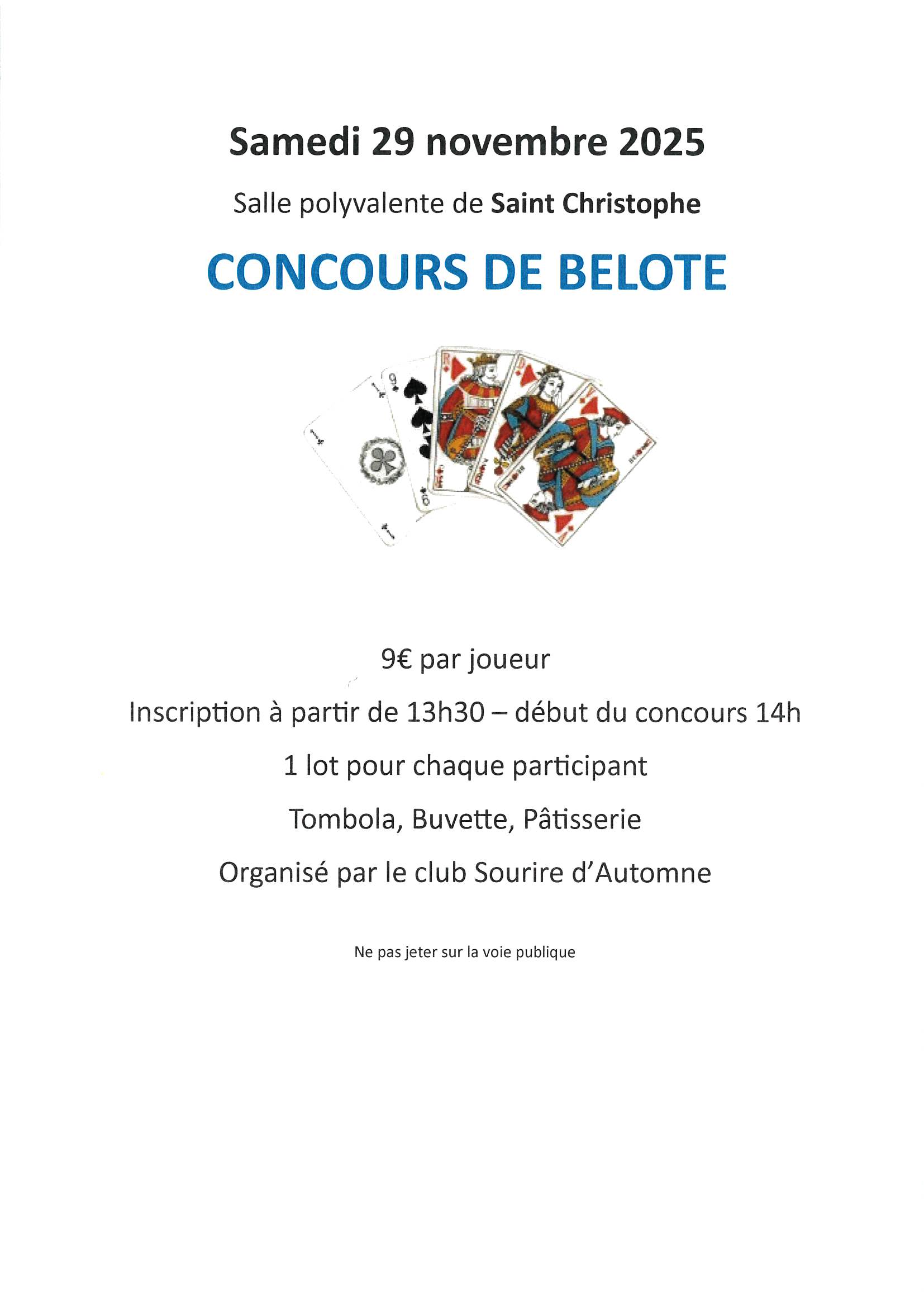 Concours de belote + Ajouter à mon Agenda Google + iCal / Outlook export 00 jours 00 heures 00 minutes 00 secondes Date 29 Nov 2025 Heure 13:30 Lieu Salle polyvalente Saint-Christophe (17) Organisateur Sourire d'Automne Partagez cet événement novembre 2025 Nov 11 2025 Commémoration de l’armistice du 11 novembre 1918 Cimetière Nov 18 2025 Ludomobile Salle des associations Nov 29 2025 Concours de belote Salle polyvalente Pas d'événement actuellement programmé.