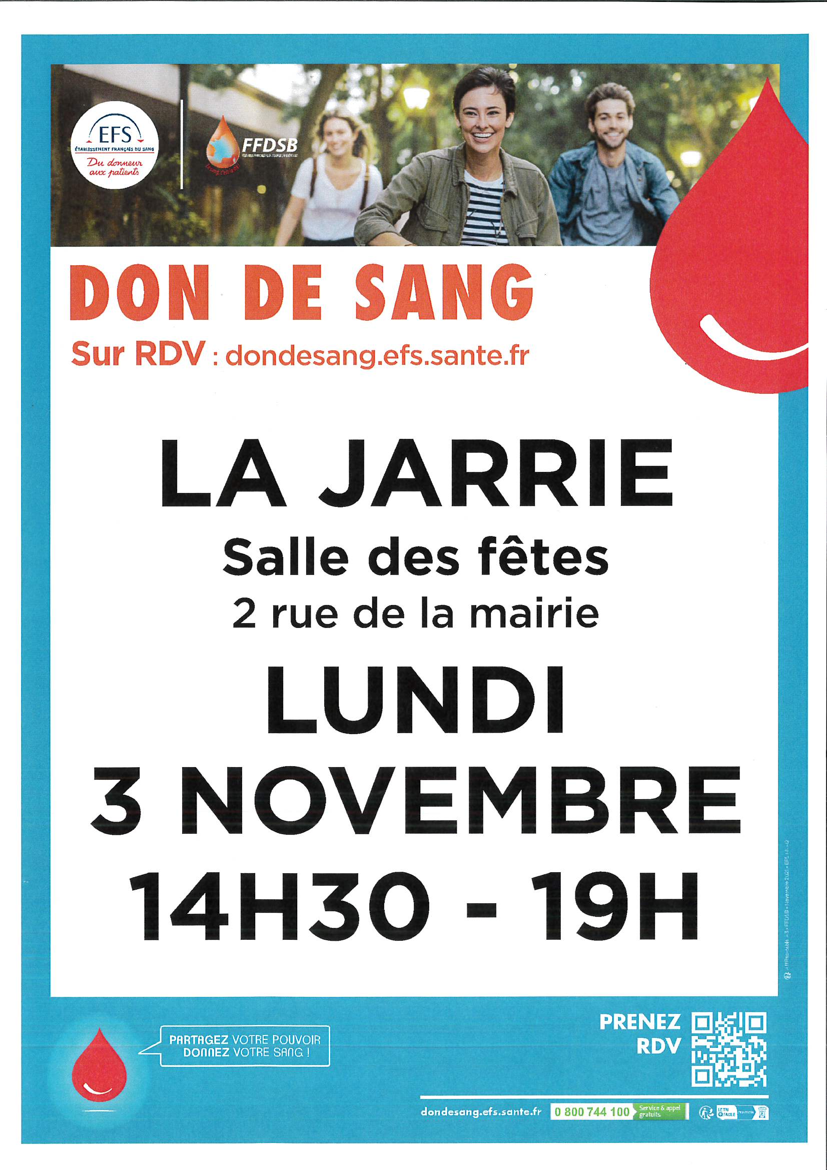 Don de sang + Ajouter à mon Agenda Google + iCal / Outlook export 00 jours 00 heures 00 minutes 00 secondes Date 03 Nov 2025 Heure 14:30 - 19:00 Lieu Salle des fêtes de La Jarrie La Jarrie Organisateur EFS Partagez cet événement octobre 2025 Oct 14 2025 Ludomobile Salle des associations novembre 2025 Nov 03 2025 Don de sang Salle des fêtes de La Jarrie Pas d'événement actuellement programmé.